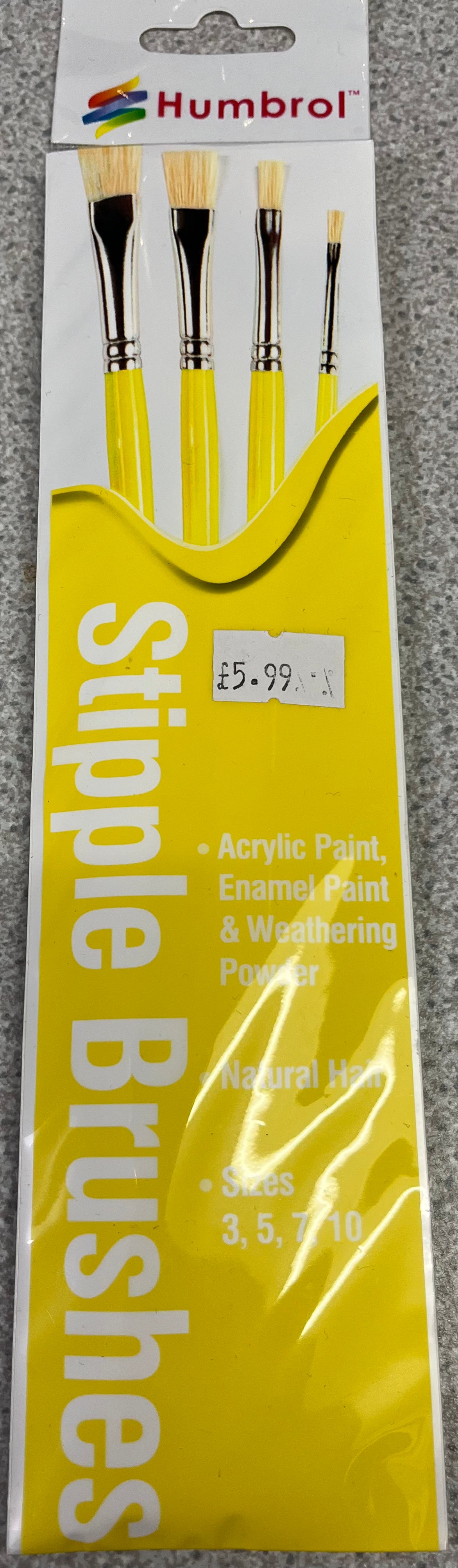 Humbrol Stipple Brush pack; natural hair for acrylic and enamel paint and for weathering powder; sizes 3, 5, 7, 10.